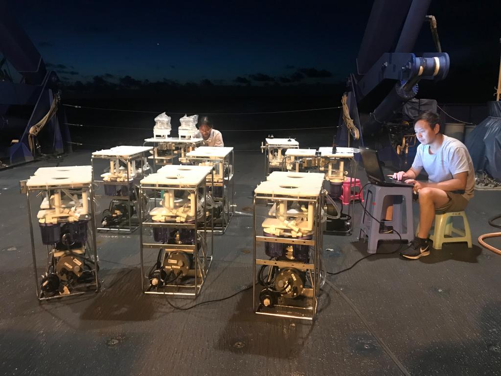 据航次联合首席科学家周宽波博士介绍,为了获得足够量的颗粒物样品用于TEIs分析,必须过滤高达数千升海水,远超常规的船载设备采样能力,这时就需要部署原位大体积过滤系统。原位大体积过滤系统,顾名思义,是悬挂在钢缆或凯氟拉缆绳上,下放至一定深度后,可以在水下定时启动水泵,并进行海洋颗粒物的原位过滤的装置,最终获取海水中的颗粒物样品。周宽波说,“相比于原装系统,本航次使用改装后的原位大体积过滤系统,具有两个泵头和三个流量计,过滤海水总体积可达1500升;同时配备了凯氟拉缆绳,以避免钢缆上的金属对样品的沾污。这也是首次在国内科考船上进行颗粒悬浮物TEIs样品采集”。