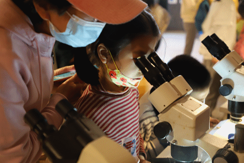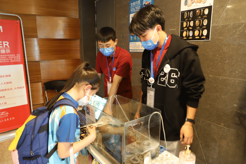 沙龙活动开始前,场外精彩的科学市集也吸引了观众们的热情参与,来自厦门大学的海洋学子们把厦大海洋科学开放日里一些有趣的科学体验搬到现场,给观众们“0”距离感受海洋魅力的机会。