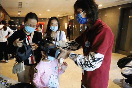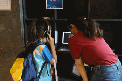 在“倾听海洋的声音”体验区,一个小小的耳机传来海冰断裂声、海下雷电声、各类海洋生物的活动声……为参观者带来了奇妙的海洋声音之旅。
