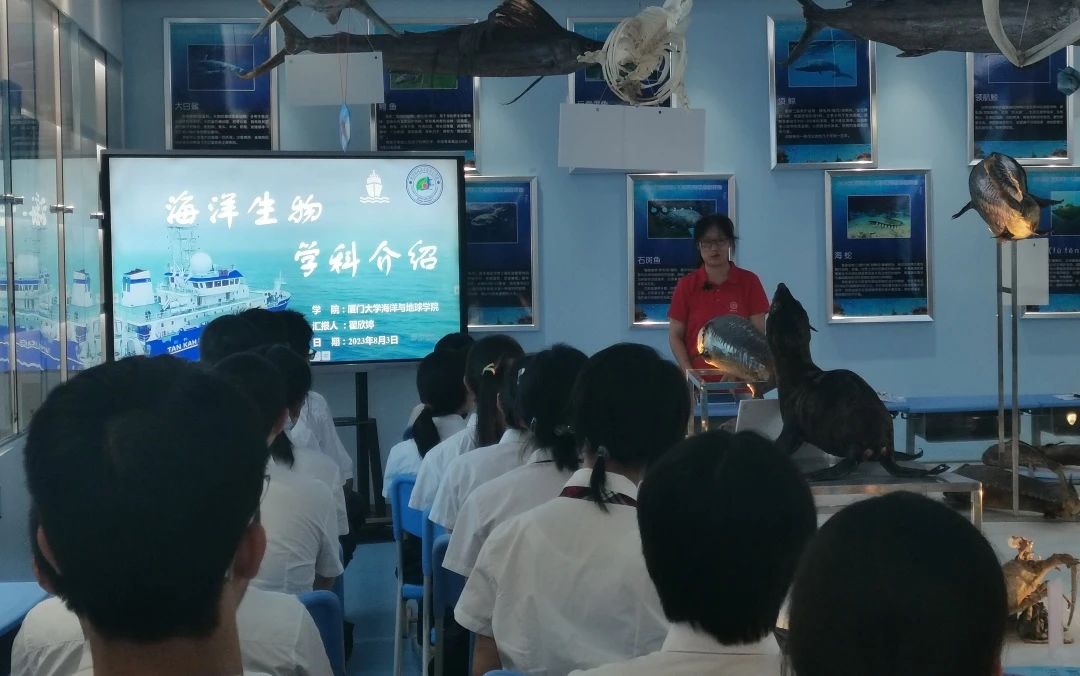 此外,在线下分会场里,厦大海地学院教授、科技中学副校长蔡明刚老师也用幽默而风趣的语言分享了自己的科考经历,厦大“勇闯深蓝,探秘海洋”暑期社会实践队的队员们亦为师弟师妹们带来了一些底栖生物标本的介绍和大学里海洋专业学习的内容分享。