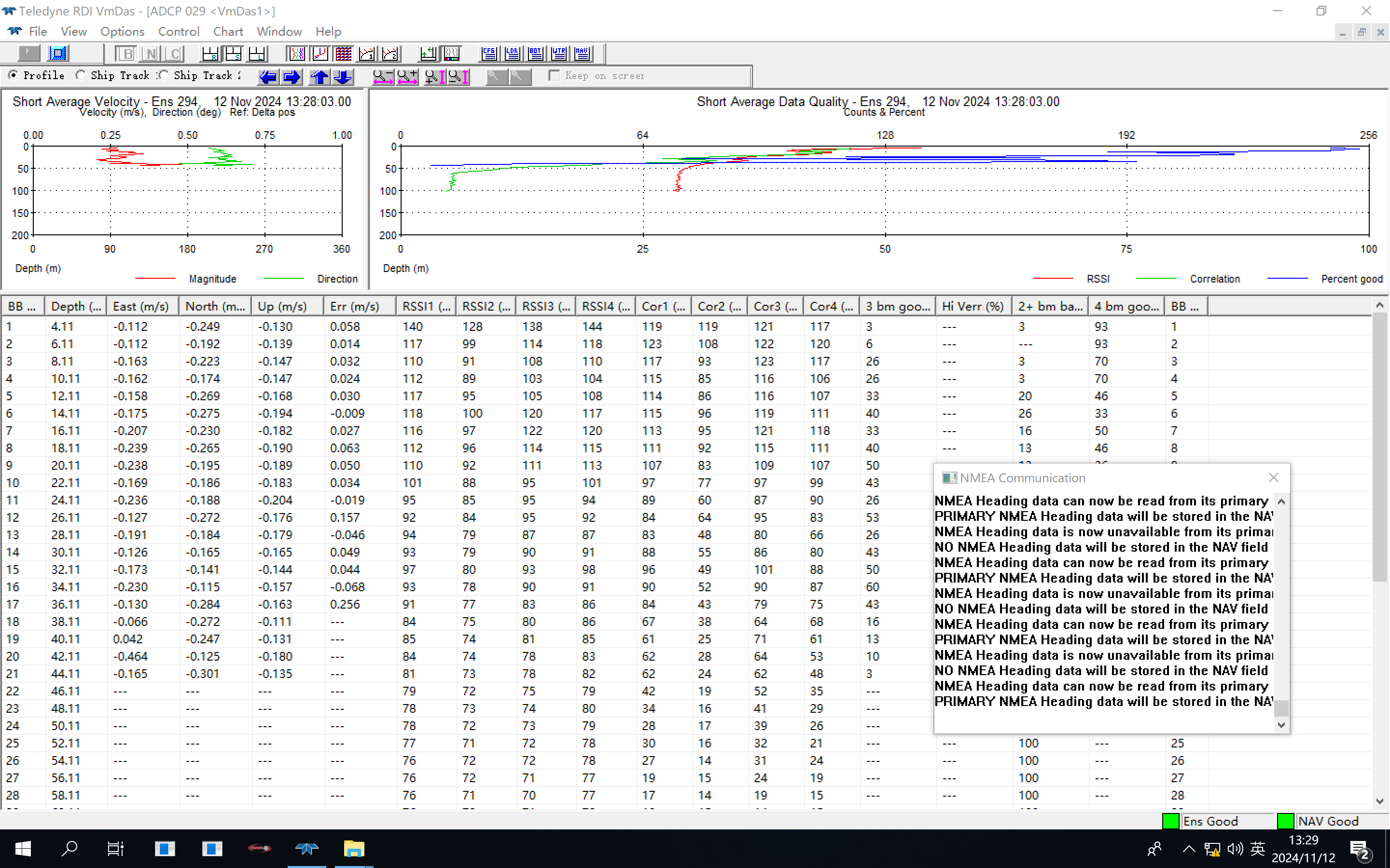 无人艇搭载的WHM600K型ADCP数据回传情况