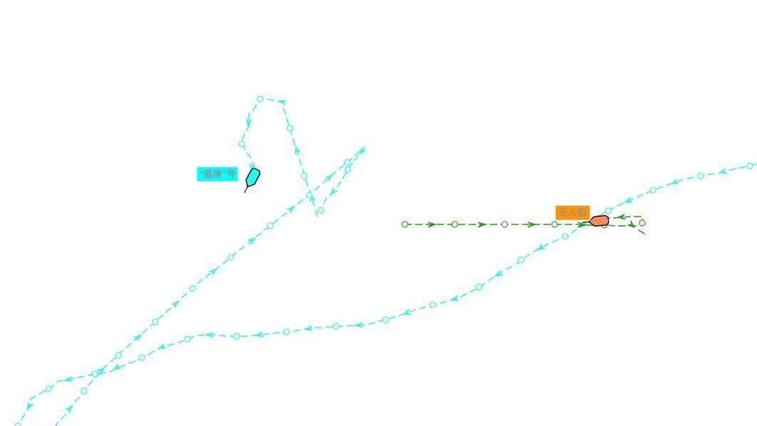 “哨鸽”系统实时显示“嘉庚”号(青色)和无人艇(黄色)的位置信息