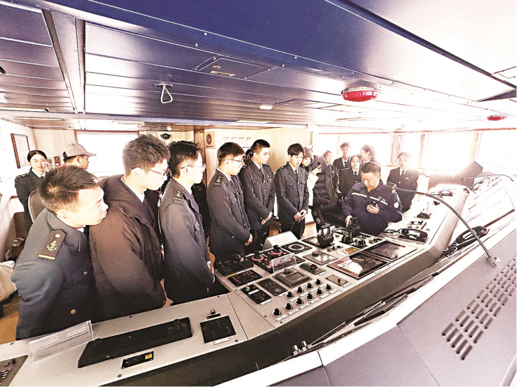 船员向福建船政交通职业学院的学生介绍“嘉庚”号上的设备设施