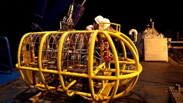 集成化光学拖体作为集海底多传感器在线探测技术、海底高清摄像照相技术于一体的大型深海科考装备,能够完成水下观测目标的高清摄像照相,并实时采集、传输、显示和记录来自水下电子舱、在线传感器以及来自船载差分GPS的精确位置等相关数据信息。在本航段中,来自中国科学院南海海洋研究所的王彦林研究员便借助该设备在某海域观测到海水的甲烷浓度远高于正常值,且在海底发现了大片碳酸盐结核,这将有助于他对海底泥火山做进一步的研究,并以此促进我国海底油气资源勘探开发。