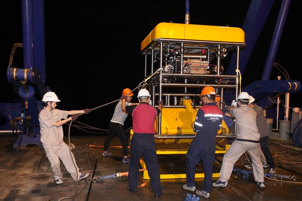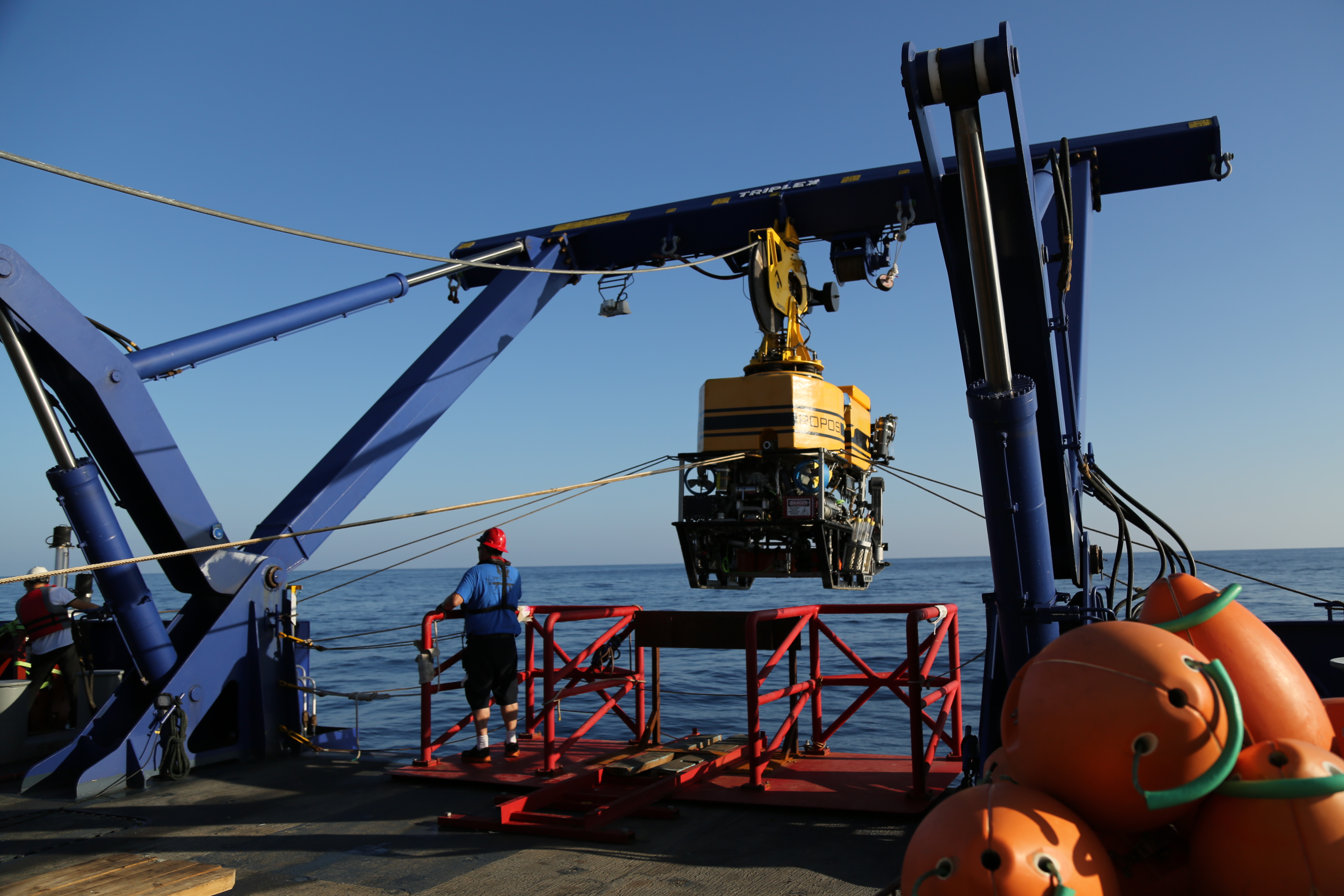 作业过程主要通过光电复合缆及绞车系统,从后甲板A架将深海遥控机器人(ROV)下放到海里收,释放ROV,ROV自行下沉到目标海区,通过脐带缆进行科考作业。ROV自带各种传感器、原位测量装置、摄像机、样品采集工具等等科考设备,科学家可以在控制室控制ROV从不同角度对海底进行观测,并采集所需的样品...