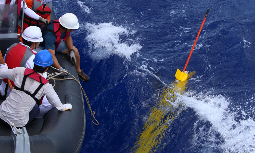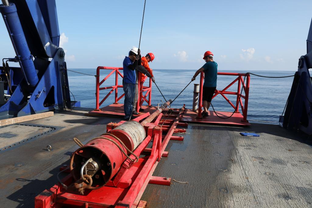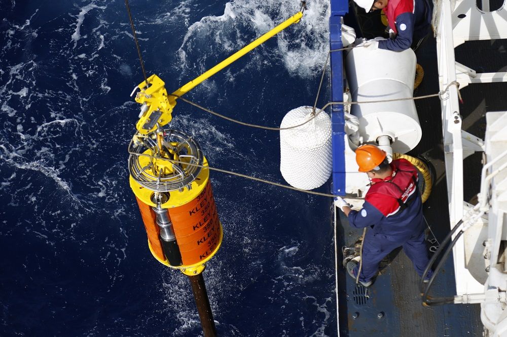 作业过程中船舶开启动力定位系统,利用折臂吊把探针转移到专用轨道系统上,通过A架及绞车系统将重达2吨多的地热探针下放至海底。探针在距离海底200-100米左右悬停2分钟,利用深海的恒温环境对探针的温度传感器进行标定;而后开始加速下放,依靠自身重力把探针插入海底沉积物中,停留10分钟以观测插入海底过程中的摩擦热衰减过程...